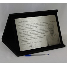 PLACA (30X20 CM) EM AÇO INOX ESCOVADO, COM A INSCRIÇÃO 'PRESIDENTE LULA, A COMUNIDADE DE GARANHUNS ALIOU-SE AOS ESFORÇOS DA CLASSE INDUSTRIAL DE PERNAMBUCO PARA A CONSAGRAÇÃO DE UMA ESCOLA TÉCNICA SENAI. COM ISSO, NOSSOS JOVENS GANHAM ACESSO A UMA FORMAÇÃO PROFISSIONAL COM A QUALIDADE NECESSÁRIA PARA ASSEGURAR SUAS INCLUSÕES NO MERCADO DE TRABALHO. A ESCOLA TÉCNICA SENAI DE GARANHUNS, BATIZADA DE EURÍDICE FERREIRA DE MELO, DONA LINDÚ, É UM TRIBUTO À PESSOA QUE SOUBE VALORIZAR A IMPORTÂNCIA DA EDUCAÇÃO PROFISSIONAL COMO INSTRUMENTO FUNDAMENTAL PARA A MELHORIA DA QUALIDADE DE VIDA DO JOVEM, DA SUA FAMÍLIA E DO PAÍS. / ... / GARANHUNS, PERNAMBUCO 16 DE DEZEMBRO DE 2005'. POSSUI FOTO DE DONA LINDÚ NO LADO DIREITO. FIXADA EM BASE DE VELUDO PRETO; E ESTA, EM ESTOJO FORRADO DE MESMO MATERIAL.