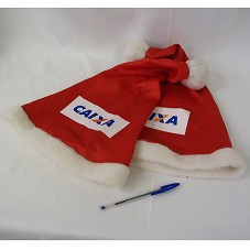 DOIS GORROS NATALINOS, EM TECIDO VERMELHO, COM BARRA E POMPOM BRANCO. POSSUEM ESTAMPA COM A LOGOMARCA DA CAIXA ECONÔMICA FEDERAL.
