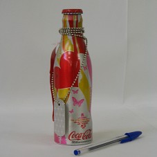 GARRAFA EM ALUMÍNIO, NO FORMATO DA GARRAFA TRADICIONAL DE COCA-COLA, DE 250 ML, CONTENDO REFRIGERANTE DE COLA. POSSUI CORPO COM PINTURA EM VERMELHO, ROSA E AMARELO, COM DESENHOS DE CORAÇÃO E BORBOLETAS E A INSCRIÇÃO 'LOVEBEING'. POSSUI A MARCA DA 'COCA-COLA' E 'LOVEBEING / THE DESIGNERS REPUBLIC / WWW.ICOKE.COM/M5 / M5 EUROPE'. ACOMPANHA CORDÃO EM ESFERAS METÁLICAS COM UMA PLACA COM DESENHOS FLORAIS; E ETIQUETA NO FORMATO DA GARRAFA, COM A INSCRIÇÃO 'AMIZADE / SONHOS / PAZ / COMPARTILHAR / AMOR / DÊ O SEU MELHOR / SÃO NOSSOS VOTOS PARA ESSE NATAL DA VICE-PRESIDÊNCIA DE ASSUNTOS GOVERNAMENTAIS / COCA-COLA'. ACONDICIONADA EM EMBALAGEM DE PAPELÃO METÁLICO, COM CINTA EM ACETATO.