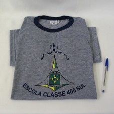 CAMISETA (TAM G2) EM MALHA CINZA-AZULADA, COM GOLA EM ELANCA AZUL-MARINHO. NA FRENTE, A INSCRIÇÃO 'GDF-SEE-GRE-PP/C / ESCOLA CLASSE 405 SUL', E SÍMBOLO DO GOVERNO DO DISTRITO FEDERAL.ATRÁS, 'ESCOLA CLASSE 405 SUL'. A CAMISETA É O UNIFORME DA ESCOLA CITADA ANTERIORMENTE.