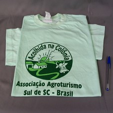 CAMISETA (TAM G) EM MALHA VERDE, DE MANGA CURTA. NA FRENTE, ESTAMPA MOSTRANDO UMA CASA RURAL E UMA VACA, E A INSCRIÇÃO 'ACOLHIDA NA COLÔNIA / ASSOCIAÇÃO AGROTURISMO SUL DE SC - BRASIL'.