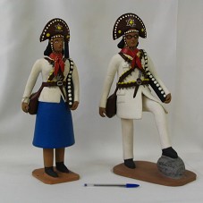 DUAS ESCULTURAS EM ARGILA, REPRESENTANDO O CASAL LAMPIÃO (24X16X48 CM) E MARIA BONITA (11X13X46 CM), VESTIDOS TIPICAMENTE E CARREGANDO ESPINGARDAS. ELA POSSUI NO BRAÇO ESQUERDO, ETIQUETA COM A INSCRIÇÃO 'ARCA / RECIFE / PERNAMBUCO / BRASIL'. NO FUNDO DA BASE DE CADA UM, GRAVAÇÃO COM O NOME DO ARTISTA 'LUIZ CARLOS'. ACOMPANHA FOLHA COM A HISTÓRIA DE LAMPIÃO E MARIA BONITA, ESCRITA EM PORTUGUÊS E INGLÊS.