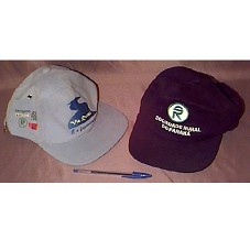 DOIS BONÉS: UM EM TECIDO DE ALGODÃO AZUL MARINHO, TRAZENDO BORDADAS UMA LOGOMARCA E A INSCRIÇÃO 'SOCIEDADE RURAL DO PARANÁ'; OUTRO EM TECIDO DE ALGODÃO AZUL CLARO TRAZENDO BORDADAS UMA LOGOMARCA E A INSCRIÇÃO 'VIA RURAL / É A FAZENDINHA...'.