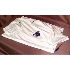 CAMISETA EM MALHA DE ALGODÃO BRANCA (TAM G), TRAZENDO ESTAMPADAS NO PEITO UMA LOGOMARCA AZUL E A INSCRIÇÃO 'VIA RURAL / É A FAZENDINHA...'.