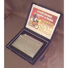 PLACA (14X20CM) EM METAL PRATEADO, GRAVADA COM A INSCRIÇÃO 'EXCELENTÍSSIMO SENHOR PRESIDENTE DA REPÚBLICA LUIS INÁCIO LULA DA SILVA, É COM MUITA ALEGRIA QUE O COLÉGIO LONDRINENSE HOMENAGEIA VOSSA EXCELÊNCIA E O PARABENIZA PELA INICIATIVA DA 'CAMPANHA FOME ZERO'. O COLÉGIO LONDRINENSE É UMA INSTITUIÇÃO CRISTÃ QUE SEMEIA A PALAVRA DA VIDA, PORQUE TEM COMO CAMINHO A PALAVRA DE DEUS QUE DIZ: 'EU SOU O PÃO DA VIDA; O QUE VEM A MIM JAMAIS TERÁ SEDE.' JOÃO 6:35 / DESEJAMOS QUE O ALIMENTO QUE NOS PROVÊ E NOS FORTALECE, JESUS, ESTEJA NOS CORAÇÕES DAQUELES QUE SÃO OS DIRIGENTES DO NOSSO PAÍS. / DR. ELEAZAR FERREIRA / DIRETOR GERAL'. ACOMPANHA PROPAGANDA DO '10º PASSEIO CICLÍSTICO E CAMINHADA CONTRA A FOME'. ACONDICIONADA EM ESTOJO AZUL.
