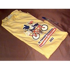 CAMISETA EM MALHA DE ALGODÃO AMARELA, TRAZENDO ESTAMPADOS NA FRENTE UMA AVE SOBRE UMA BICICLETA E A INSCRIÇÃO '10º PASSEIO CICLISTICO E CAMINHADA CONTRA A FOME / 2003', E NAS COSTAS TRÊS LOGOMARCAS E A INSCRIÇÃO 'LONDRINENSE É CONTRA A FOME / COLÉGIO LONDRINENSE / FUNDAÇÃO DE ESPORTES - LONDRINA / PROVOPAR AÇÃO SOCIAL'.
