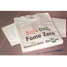 CAMISETA (TAM M) EM MALHA DE ALGODÃO BRANCA, COM A INSCRIÇÃO EM LARANJA, VERDE, PRETO, AZUL E BRANCO 'SOJA DEZ, FOME ZERO - KINASOY DO BRASIL - EMBRAPA'.