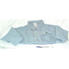 CAMISA DE MANGA CURTA, EM ÍNDIGO BLUE, TAMANHO 'M', COM BORDADO EM VERDE, AMARELO E AZUL DO EMBLEMA DO MINISTÉRIO DA AGRICULTURA, PECUÁRIA E ABASTECIMENTO, DO LADO DIREITO, EM CIMA DO BOLSO.