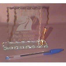 DOIS PORTA-CANETAS, IDÊNTICOS, DE VIDRO E METAL, COM A SEGUINTE INSCRIÇÃO 'O PODER DO DEUS VIVO HABITA NESTA CASA - INST. TERAPÊUTICO PAULO AMORIM - TEL.: (11) 5093-0407'.