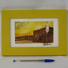 PINTURA SOBRE TELA (14,5X8,5 CM), RETRATANDO O MURO DE UM FORTE (TEXTURIZADO EM MARROM) E UMA TORRE EM UMA DAS QUINAS. PREDOMINA OS TONS DE AMARELO E MARROM. NO CANTO INFERIOR DIREITO, ASSINATURA DO ARTISTA, 'RDMOREIRA'. MOLDURA (25X17,5 CM) EM MADEIRA LAMINADA DE AMARELO, E PASSE-PARTOUT NA PRÓPRIA TELA.