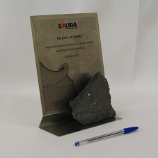 AMOSTRA (12X10X2 CM) DE MINÉRIO DE FERRO, FIXADA NA BASE DE PLACA VERTICAL (17,5X22X6 CM), EM AÇO, ONDE HÁ A INSCRIÇÃO 'SÓLIDA MINERAÇÃO S/A / MINÉRIO DE FERRO / PROVÍNCIA MINERAL DE TARTARUGALZINHO-AMAPÁ / AMOSTRA DO PRIMEIRO EMBARQUE / SETEMBRO 2005'.