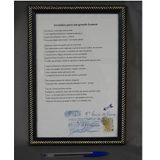 ACRÓSTICO COM O NOME DO PRESIDENTE 'LUIZ INACIO LULA DA SILVA', INTITULADO 'ACRÓSTICO PARA UM GRANDE HOMEM', HOMENAGEANDO-O. ENQUADRADO EM MOLDURA (23X33 CM) DE MADEIRA PINTADA DE AZUL COM DETALHES DOURADOS E TAMPO DE VIDRO. POSSUI ASSINATURA DA AUTORA NO CANTO INFERIOR DIREITO, 'Mª EUNICE DE QUEIROZ'; E CARIMBO DE REGISTRO NO CARTÓRIO DO 2º OFÍCIO DE NOTAS - MATEUS LEME -MG; E SELO DE FISCALIZAÇÃO DE RECONHECIMENTO DE FIRMA.