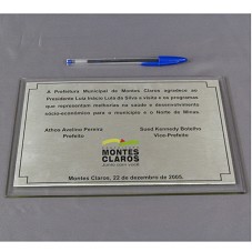 PLACA (23X15,8 CM) EM AÇO ESCOVADO, FIXADO EM BASE DE ACRÍLICO BISOTADO (25X18X0,5 CM). POSSUI A INSCRIÇÃO 'A PREFEITURA MUNICIPAL DE MONTES CLAROS AGRADECE AO PRESIDENTE LUIZ INÁCIO LULA DA SILVA A VISITA E OS PROGRAMAS QUE REPRESENTAM MELHORIAS NA SAÚDE E DESENVOLVIMENTO SÓCIO-ECONÔMICO PARA O MUNICÍPIO E O NORTE DE MINAS. / ATHOS AVELINO PEREIRA PREFEITO / SUED KENNEDY BOTELHO VICE-PREFEITO / ... / MONTES CLAROS, 22 DE DEZEMBRO DE 2005.'. ACONDICIONADA EM ESTOJO FORRADO EM LYCRA AZUL MARINHO.