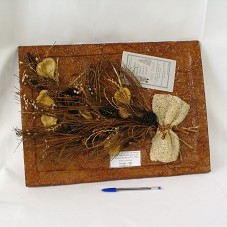 QUADRO (49X36 CM) CONFECCIONADO EM MATERIAL RECICLADO. MOLDURA/TELA CONFECCIONADA EM PAPEL MACHÊ E PAPELÃO, COM APLICAÇÃO DE VERNIZ. NO CENTRO, UM RAMALHETE DE FLORES E FRUTOS SECOS. ACOMPANHA CARTÃO DE NATAL EM PEDAÇO DE TECIDO COM A INSCRIÇÃO 'SR. PRES. DA REPÚBLICA LUIZ INÁCIO LULA DA SILVA / O NOSSO MAIOR PRESENTE DE NATAL É JESUS NOS CORAÇÕES / FELIZ NATAL / PETI - PROGRAMA DE ERRADICAÇÃO DO TRABALHO INFANTIL E AGENTE JOVEM / PREFEITURA MUNICIPAL DE LONTRA / MINAS GERAIS / DEZEMBRO 2005'. ATRÁS, NOME DO ARTISTA E ENDEREÇO. ACONDICIONADO EM CAIXA DE PAPELÃO VERMELHA, COM ROSAS ARTIFICIAIS NA TAMPA.