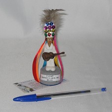 ARTESANATO (3,7X3,7X10,5 CM) EM ARGILA, RETRATANDO UM CATOPÊ, INTEGRANTE DE UM GRUPO DE FOLIA QUE SAI ÀS RUAS, DEVOTANDO SUAS CRENÇAS NO PODER DIVINO. FIGURA DE UM HOMEM, COM UMA VIOLA, VESTIDO CARACTERISTICAMENTE: ROUPA BRANCA, CHAPÉU COM PENAS, LANTEJOULAS E FITAS DE CETIM. NA BASE, 'CATOPÊ / MONTES CLAROS - MG / BRASIL'. ATRÁS, 'SÍLVIA VELOSO / (38) 3216-9838 / 9969-2863'. ACOMPANHA CARTÃO 'CULTURA MONTESCLARENSE' DESCREVENDO A TRADIÇÃO. ACONDICIONADO EM CAIXA DE PAPELÃO COM FRENTE EM ACETATO.