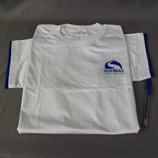 CAMISETA (TAM G) EM MALHA BRANCA, DE MANGA CURTA, COM DETALHES NA COR AZUL NA BARRA DAS MANGAS E DA CAMISA. NA FRENTE, ESTAMPA EM AZUL E VERDE COM A INSCRIÇÃO 'SOEBRAS / ASSOCIAÇÃO EDUCATIVA DO BRASIL', E LOGOMARCA.