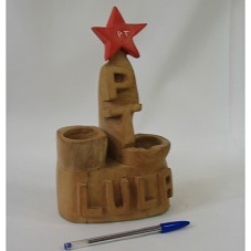 PORTA-LÁPIS E CINZEIRO ESCULPIDOS EM UMA PEÇA DE MADEIRA (13,5X8X23 CM). AO LADO DO CINZEIRO, PEÇA NA VERTICAL, LEMBRANDO UM TOTEM, ONDE NA EXTREMIDADE SUPERIOR HÁ UMA ESTRELA VERMELHA COM A INSCRIÇÃO 'PT', E AO LONGO DELE, EM ALTO RELEVO, 'PT'. NA BASE DO OBJETO, 'LULA', ESCULPIDO EM ALTO RELEVO. NA PARTE INFERIOR DA BASE, PAPEL COLADO COM A INSCRIÇÃO 'PARA LULA UMA LEMBRANÇA DO ANIVERSÁRIO DO PT 25 ANOS / FEITO POR DENER ARTISTA / M. CLAROS MG / TEL 3221 2055 / 38 - 32212055'.