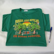 CAMISETA EM MALHA VERDE, DE MANGA CURTA. NA FRENTE, ESTAMPA COM DESENHO DE DUAS ÁRVORES EMOLDURANDO A ENTRADA DE UM PORTÃO E 'PARQUE JOÃO BOTELHO / UM SONHO POSSÍVEL'.