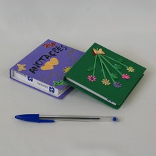 DOIS BLOCOS DE ANOTAÇÕES. O PRIMEIRO (10,2X9,7X1,3 CM) COM CAPA VERDE, TENDO NA MESMA, MONTAGEM COM COLAGEM DE UM RAMALHETE DE FLORES E UMA BORBOLETA, CONFECCIONADOS EM PAPÉIS COLORIDOS. O SEGUNDO (10,4X10,2X2,1 CM) COM CAPA LILÁS E A INSCRIÇÃO 'ANOTAÇÕES', COM RECORTES EM FORMATO DE BORBOLETAS, SOL E CORAÇÕES COLADOS NA CAPA. AMBOS POSSUEM NA CONTRACAPA FINAL UM CARIMBO COM DADOS DO REMETENTE.