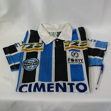 CAMISA DE FUTEBOL (TAM G), DO MONTES CLAROS FUTEBOL CLUBE, COM LISTRAS VERTICAIS NAS CORES AZUL, BRANCA E PRETA. POSSUI A INSCRIÇÃO 'CIMENTO MONTES CLAROS' NA FRENTE E ATRÁS, E AINDA O NÚMERO '7'.