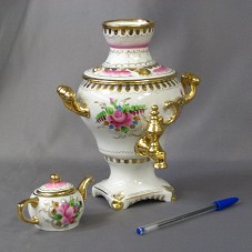 OBJETO (17X15,5X21 CM) EM PORCELANA IMITANDO UM FILTRO DE ÁGUA, COM ALÇAS DOURADAS NAS LATERAIS, E PINTURAS FLORAIS AO LONGO DELE. POSSUI TAMPA, EM MESMO ESTILO. ACOMPANHA MINI BULE (1X6X6 CM) EM MESMO MATERIAL E COM MESMO ACABAMENTO.