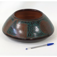 FRUTEIRA (29X16X15 CM) EM CERÂMICA, EM MARROM ESCURO, COM INCISÃO DE MOTIVOS MARAJOARAS, NA COR VERDE. ACONDICIONADA EM EMBALAGEM PRÓPRIA, EM PAPELÃO, FORRADA EM PAPEL RECICLADO COM A INSCRIÇÃO 'MISTURA BRASILEIRA CAIXA', NA TAMPA. E, NA PARTE INTERNA, DESCRIÇÃO DO PROJETO APOIADO PELA CAIXA ECONÔMICA FEDERAL, 'PROJETO ARTESANATO BRASIL COM DESIGN'. OBJETO FAZ PARTE DA COLEÇÃO 'MISTURA BRASILEIRA'.