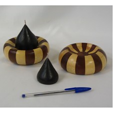DOIS PARES DE CASTIÇAIS (12X12X4,5 CM), DE FORMATO CIRCULAR, COM BASES INTERNA E EXTERNA AFUNDADAS, CONFECCIONADOS EM MARCHETARIA, COM MADEIRAS CLARA E ESCURA DA REGIÃO DE LONDRINA. ACOMPANHA DUAS VELAS EM FORMATO TRIANGULAR, COM BASES ARREDONDADAS, DE COR ESCURA. ACONDICIONADOS EM EMBALAGEM PRÓPRIA, EM PAPELÃO, FORRADA EM PAPEL RECICLADO COM A INSCRIÇÃO 'MISTURA BRASILEIRA CAIXA', NA TAMPA. E, NA PARTE INTERNA, DESCRIÇÃO DO PROJETO APOIADO PELA CAIXA ECONÔMICA FEDERAL, 'PROJETO ARTESANATO BRASIL COM DESIGN'. OBJETO FAZ PARTE DA COLEÇÃO 'MISTURA BRASILEIRA'.