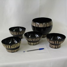 CONJUNTO DE CUIAS FORMADO POR UMA TIGELA GRANDE E QUATRO PEQUENAS, TINGIDAS COM CORANTE NATURAL PRETO (TINTURA EXTRAÍDA DA CASCA DO AXUAZEIRO), E DECORADAS COM INCISÕES BRANCAS DE MOTIVOS INDÍGENAS. CADA UMA POSSUI UM SUPORTE DE MESA, EM MESMO MATERIAL. ACONDICIONADOS EM EMBALAGEM PRÓPRIA, EM PAPELÃO, FORRADA EM PAPEL RECICLADO COM A INSCRIÇÃO 'MISTURA BRASILEIRA CAIXA', NA TAMPA. E, NA PARTE INTERNA, DESCRIÇÃO DO PROJETO APOIADO PELA CAIXA ECONÔMICA FEDERAL, 'PROJETO ARTESANATO BRASIL COM DESIGN'. OBJETO FAZ PARTE DA COLEÇÃO 'MISTURA BRASILEIRA'.