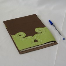 BLOCO DE ANOTAÇÕES (14,5X21X0,5 CM) EM PAPEL RECICLADO. POSSUI CAPA (16,2X23 CM) EM COURO MARROM, COM DETALHES EM COURO VERDE, DECORADO COM MOTIVOS TRADICIONAIS DO NORDESTE. ACONDICIONADO EM EMBALAGEM PRÓPRIA, EM PAPELÃO, FORRADA EM PAPEL RECICLADO COM A INSCRIÇÃO 'MISTURA BRASILEIRA CAIXA', NA TAMPA. E, NA PARTE INTERNA, DESCRIÇÃO DO PROJETO APOIADO PELA CAIXA ECONÔMICA FEDERAL, 'PROJETO ARTESANATO BRASIL COM DESIGN'. OBJETO FAZ PARTE DA COLEÇÃO 'MISTURA BRASILEIRA'.