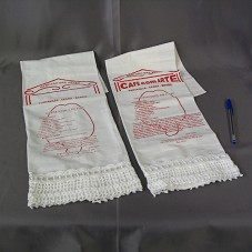DOIS PANOS DE PRATO, EM TECIDO BRANCO, COM BICO EM CROCHÊ. POSSUEM ESTAMPAS EM VERMELHO. UM COM RECEITA DE 'CARNE BÁSICA DE CAJU'; OUTRO, 'STROGONOFF DE CAJU'.