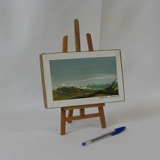 PINTURA (17X9 CM) SOBRE TELA (20X12,3 CM), EM TONS DE VERDE, MARROM E AZUL, MOSTRANDO UM RIO, COM UM TRONCO DE ÁRVORE EM PRIMEIRO PLANO, E VEGETAÇÃO AO FUNDO. NO CANTO INFERIOR DIREITO, 'WAGNER RIBEIRO / 05'. ATRÁS, 'OBRA: POROROCA / AUTOR: WAGNER RIBEIRO / TÉCNICA: ACRÍLICA S/ TELA / FONE: (96)9963 4332 / AMAPÁ BRASIL'. ACOMPANHA MINI CAVALETE EM MADEIRA, PARA COLOCAÇÃO DA TELA. ACONDICIONADA EM CAIXA DE PAPELÃO, COM A INSCRIÇÃO 'ARTES DO AMAPÁ' NA TAMPA.