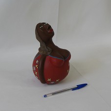 ESCULTURA (13X12X18 CM) CONFECCIONADA EM CABAÇA, MOSTRANDO UMA MULHER NEGRA, OLHANDO PARA CIMA, USANDO VESTIDO VERMELHO COM ESTAMPA FLORAL. NO LATERAL DIREITA FRONTAL INFERIOR, ASSINATURA DA ARTISTA 'ANAYRA'. ACONDICIONADA EM CAIXA DE PAPELÃO BRANCO.