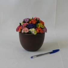 VASO (10,4X10,4X13,5 CM) COM FLORES COLORIDAS (LILÁS, ROXO, AMARELO, LARANJA, ROSA), CONFECCIONADOS EM CERÂMICA. NA BASE DO VASO, A INSCRIÇÃO 'CORES DA TERRA'. ACOMPANHA CARTÃO POSTAL COM INFORMAÇÕES SOBRE A INSTITUIÇÃO. ACONDICIONADO EM CAIXA DE PAPELÃO, COM A INSCRIÇÃO 'CORES DA TERRA / CERÂMICA E FERRO', NAS LATERAIS E NA TAMPA.