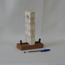 ESCULTURA (14X6X20,5 CM) EM MADEIRA TEXTURIZADA COM MASSA E GRÃOS. COMPOSTA POR ELEMENTO RETANGULAR VERTICAL, COM FURO NO CENTRO SUPERIOR, FIXADO EM BASE RETANGULAR, ONDE HÁ DOIS OBJETOS HORIZONTAIS, COM EXTREMIDADE VIRADA PARA CIMA. UM DESSES ESTÁ COM A PONTA RACHADA. PINTADA EM TONS DE MARROM E BEGE. EM UMA DAS LATERAIS DA BASE, A INSCRIÇÃO 'PANTALEÃO'.