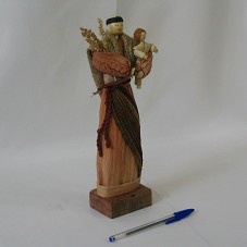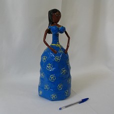 ESCULTURA EM PAPEL-MACHÊ (11,7X12,2X35,5 CM), RETRATANDO UMA MULHER MORENA, USANDO VESTIDO AZUL COM ESTAMPA FLORAL AMARELA. NA PARTE POSTERIOR INFERIOR, A INSCRIÇÃO 'SILVANIA, ACONIZAL-MT, 2005'.