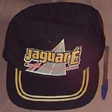 BONÉ CONFECCIONADO EM TECIDO PRETO, COM DUAS LISTAS AMARELAS NA ABA, TRAZENDO GRAVADA A INSCRIÇÃO 'JAGUARÉ / CAMINHANDO COM SUCESSO / JAGUARÉ-ES / O MAIOR PRODUTOR DE CAFÉ DO BRASIL'.