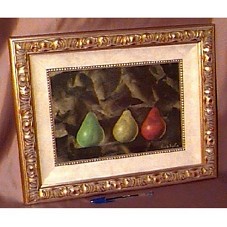 QUADRO (37X46CM) CONTENDO PINTURA QUE RETRATA UMA NATUREZA MORTA COMPOSTA POR TRÊS PÊRAS, SENDO UMA VERDE, OUTRA AMARELA E OUTRA VERMELHA, SOBRE FUNDO PRETO E DOURADO. MOLDURA EM MADEIRA DOURADA COM PASSE-PARTOUT NA COR MÁRMORE E PROTEÇÃO EM ACRÍLICO TRANSPARENTE.