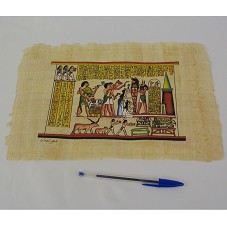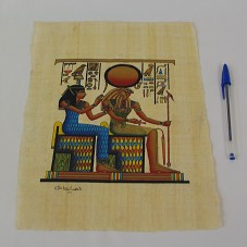 PINTURA (16,5X19,5 CM) EM PAPIRO (23,5X33,5 CM), EM TONS COLORIDOS, PREDOMINANDO O DOURADO E O AZUL, MOSTRANDO ANTIGAS PINTURAS EGÍPCIAS, O REI E A RAINHA SENTADOS NO TRONO. O REI COM MÁSCARA DE UMA ÁGUIA, SEGURANDO UM CAJADO LEMBRANDO UMA COBRA. NA PARTE SUPERIOR, HIERÓGLIFOS DA ÉPOCA. NA PARTE INFERIOR ESQUERDA, ASSINATURA DO ARTISTA (NÃO FOI POSSÍVEL IDENTIFICAR O NOME). ATRÁS, CARIMBO COM A INSCRIÇÃO 'FAHMY KAMEL / ORIGINAL POPYRUS / HAND MADE / MADE IN EGYPT'.