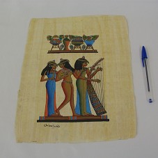PINTURA (14,5X23 CM) EM PAPIRO (23,5X33,5 CM), EM TONS COLORIDOS, PREDOMINANDO O DOURADO, O VERDE E O AZUL, MOSTRANDO ANTIGAS PINTURAS EGÍPCIAS, TRÊS MULHERES TOCANDO INSTRUMENTOS MUSICAIS; ACIMA DELAS JARROS COM FRUTOS E FOLHAS. NA PARTE INFERIOR ESQUERDA, ASSINATURA DO ARTISTA (NÃO FOI POSSÍVEL IDENTIFICAR O NOME). ATRÁS, CARIMBO COM A INSCRIÇÃO 'FAHMY KAMEL / ORIGINAL POPYRUS / HAND MADE / MADE IN EGYPT'.