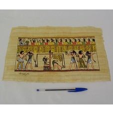 PINTURA (27,5X14,5 CM) EM PAPIRO (23,5X33,5 CM), EM TONS COLORIDOS, PREDOMINANDO O AMARELO, O SALMÃO E O VERDE, MOSTRANDO ANTIGAS PINTURAS EGÍPCIAS, VÁRIOS HOMENS COM CABEÇAS DE ANIMAIS, UMA BALANÇA NO CENTRO; E, NA PARTE SUPERIOR, MULHERES SENTADAS NA MESMA POSIÇÃO. NA PARTE INFERIOR ESQUERDA, ASSINATURA DO ARTISTA (NÃO FOI POSSÍVEL IDENTIFICAR O NOME). ATRÁS, CARIMBO COM A INSCRIÇÃO 'FAHMY KAMEL / ORIGINAL POPYRUS / HAND MADE / MADE IN EGYPT'.
