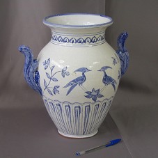 VASO CERÂMICO (31X22X32,5 CM), COM PINTURA BRANCA CRAQUELADA E DETALHES EM AZUL AQUARELADO, COM DESENHOS DE FLORES E AVES. POSSUI DUAS ALÇAS NAS LATERAIS. NO FUNDO DA BASE, ETIQUETA DA INSTITUIÇÃO, 'ESCOLA DE ARTES TEÓS - PORTO VELHO-RO BRASIL / PRODUTOS DA AMAZÔNIA (69) 3226-1355 / SELO DE QUALIDADE'.