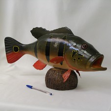 ESCULTURA EM MADEIRA, FORMATO DE UM PEIXE TUCUNARÉ (53X16X17 CM), FIXADO EM BASE (12,5X12X8 CM) DE MADEIRA SEMELHANTE A UM CÔCO. NESTA, A INSCRIÇÃO 'BARCELOS - AM'.