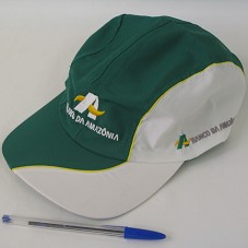 BONÉ EM POLIÉSTER VERDE E BRANCO. NA FRENTE E NAS LATERAIS A MARCA DO BANCO DA AMAZÔNIA.