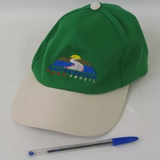 BONÉ EM TECIDO VERDE, COM ABA BEGE. NA FRENTE BORDADO A MARCA DA 'INTEROCEÂNICA PERU BRASIL', ATRÁS A INSCRIÇÃO 'INTEGRACION Y DESARROLLO'.