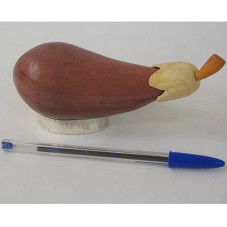 ARTESANATO EM MADEIRA (6,5X14,5 CM) NO FORMATO DE BERINJELA, COM BASE EM PRATA POLIDA. POSSUI UM CARTÃO COM A INSCRIÇÃO 'ARTESANÍA DE MADERA / CON APLICACIONES EN PLATA 925'. ACONDICIONADO EM CAIXA DE PAPELÃO (10,5X15X9 CM).