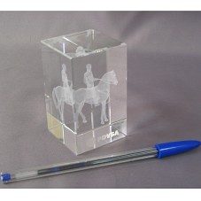 CRISTAL EM FORMA RETANGULAR (8X5X5 CM), COM A IMAGEM TRIDIMENSIONAL DE SIMOM BOLÍVAR MONTADO À CAVALO, GRAVADA A LASER EM SEU INTERIOR. POSSUI A INSCRIÇÃO 'PDVSA'. ACONDICIONADO EM UMA CAIXA DE PAPELÃO AZUL (6X9X6 CM)