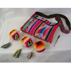 BOLSA EM TECIDO (28X32 CM), LISTRADA NAS CORES AZUL, VERDE E ROSA, COM DESENHOS DE ANIMAIS (AVES E PÁSSAROS) E FLORES, E ALÇA EM TECIDO E COURO. POSSUI NA PARTE DE BAIXO TRÊS POMPONS COLORIDOS, FEITOS EM TRICÔ.