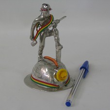 ESCULTURA EM AÇO (12 CM), RETRATA A FIGURA DE UM OPERÁRIO COM FERRAMENTAS EM SUAS MÃOS E UMA FAIXA COM AS CORES DA BOLÍVIA. A BASE É UM CAPACETE DE OPERÁRIO COM AS INSCRIÇÕES 'RDO. DE BOLIVIA AL EXCL. PDTE CONST. DE BRASIL LUIS IG. LULA DA SILVA. MUCHAS FELICIDADES A NOMBRE DE DOS CC: MINEROS DE BOLIVIA / COMIBOL. PATRIMONIO NAL / ESTAÑO, PLATA, ORO, ZING. / POR SU LUCHA EN P.T. A.ZARAL N. EX.DIGT. F.S.T.M.B. / CITA BIBLICA JEM. 9:23-24 / LA PAZ - 22 ENERO 2006.'