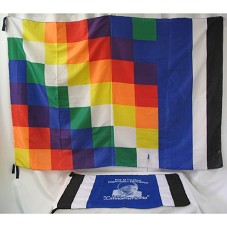 DUAS BANDEIRAS, SENDO A PRIMEIRA (102X147 CM ), COMPOSTA DE PARTES QUADRICULADAS COM AS CORES VERDE, BRANCA, LARANJA, AMARELA, AZUL E VERMELHA E PARTES LISTRADAS COM AS CORES AZUL, BRANCA E PRETA E A SEGUNDA (47X75 CM) LISTRADA COM AS CORES AZUL, BRANCA E PRETA, TENDO NO CENTRO A ESTAMPA DE EVO MORALES E A INSCRIÇÃO 'POR LA UNIDAD, DIGNIDAD E IDENTIDAD LATINOAMERICANA / EVO'.