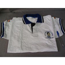 CAMISA GOLA POLO, NA COR BRANCA E A GOLA NA CORES AZUL, BRANCA E PRETA. NA PARTE SUPERIOR ESQUERDA BORDADA A ESTAMPA DE EVO MORALES E A INSCRIÇÃO 'POR LA UNIDAD, DIGNIDAD E IDENTIDAD LATINOAMERICANA / EVO'. NAS MANGAS, BORDADAS A BANDEIRA DO MAS E A INSCRIÇÃO 'EVO PRESIDENTE' E AS CORES DA BOLÍVIA E DO MAS.